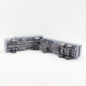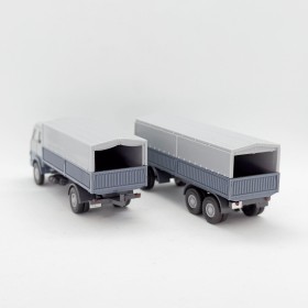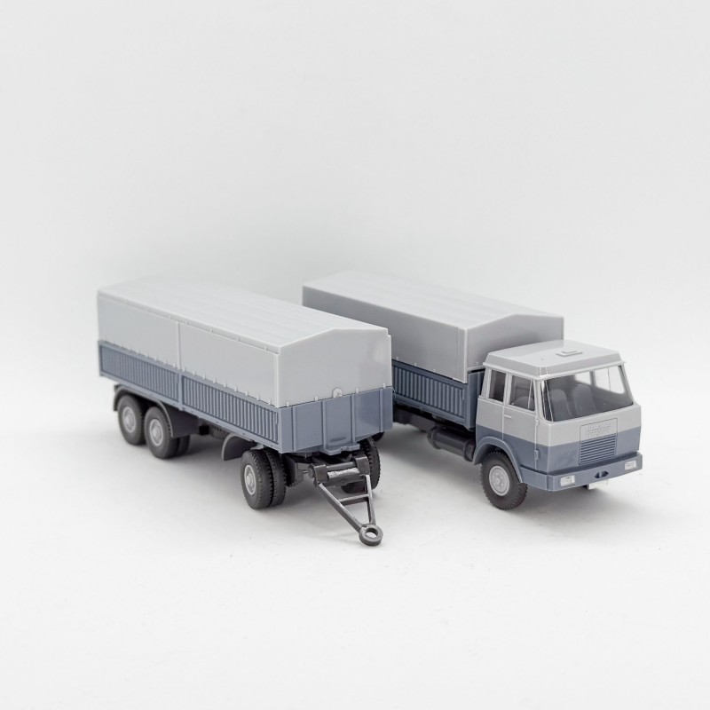 Blue/grey Hanomag-Henschel flat bed truck with trailer with cover.