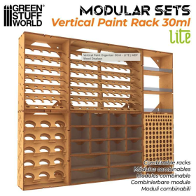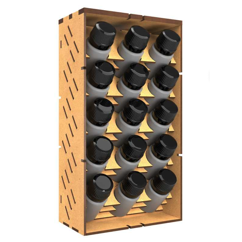 Paint rack for 15 pcs of 30 ml bottle, e.g Vallejo Washes or Metal color. Multiple of these modules can be combined. 15 x 28 x 8,2 cm. To reinforce it we recommend using PVA glue.