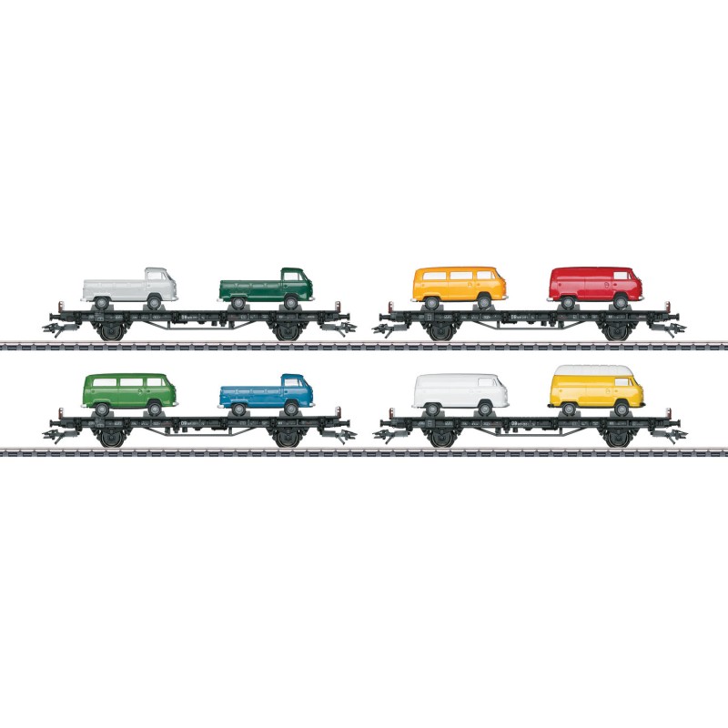 Tysk godsvagnsats med biltransport-vagnar. Lastade med VW bussar. Godsvagnssats, Analog , H0 (1:87)