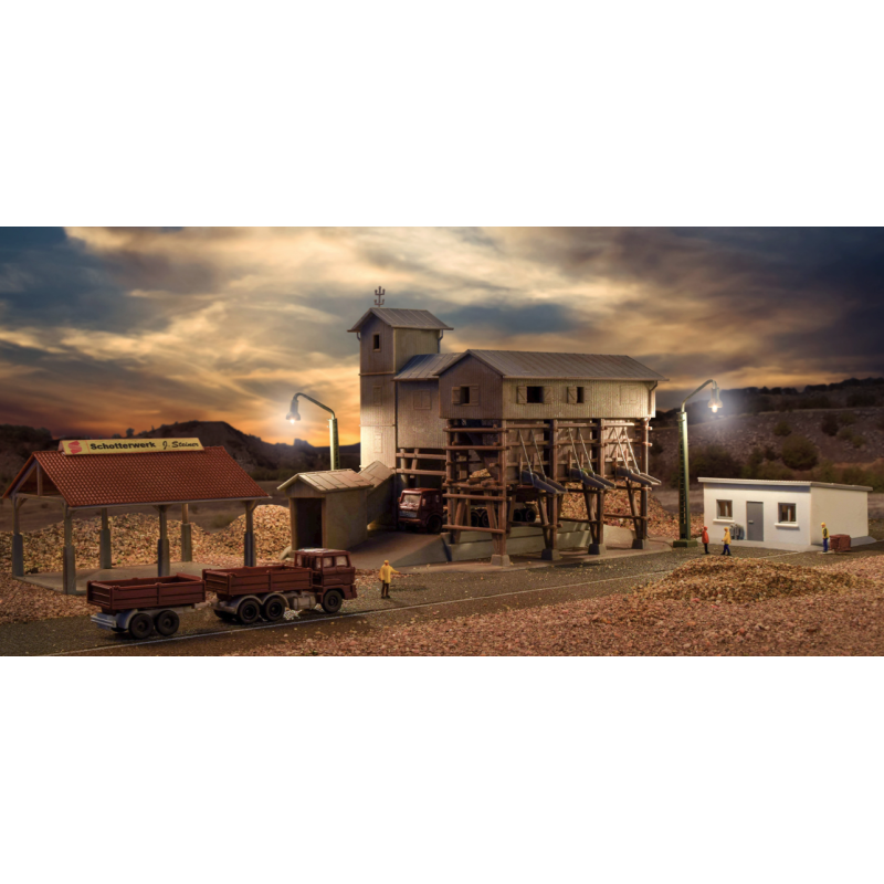 Kit. Set consists of gravel plant, 2 trucks, an office building and a covered storage area.