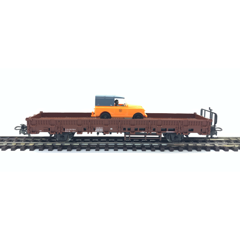Svensk rödbrun stolpvagn lastad med orange Land Rover ”SJ”. SJ Godsvagn, , H0 (1:87)